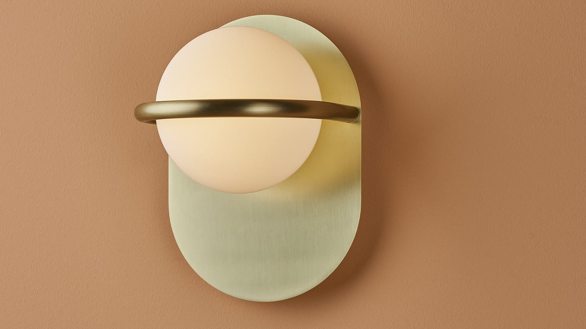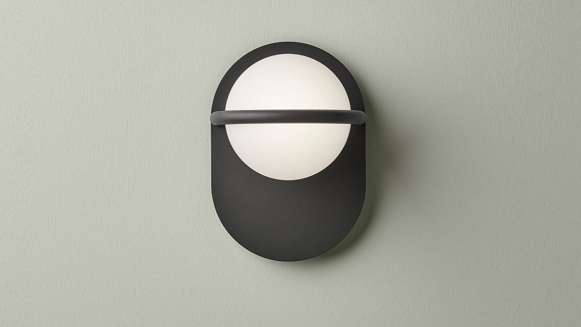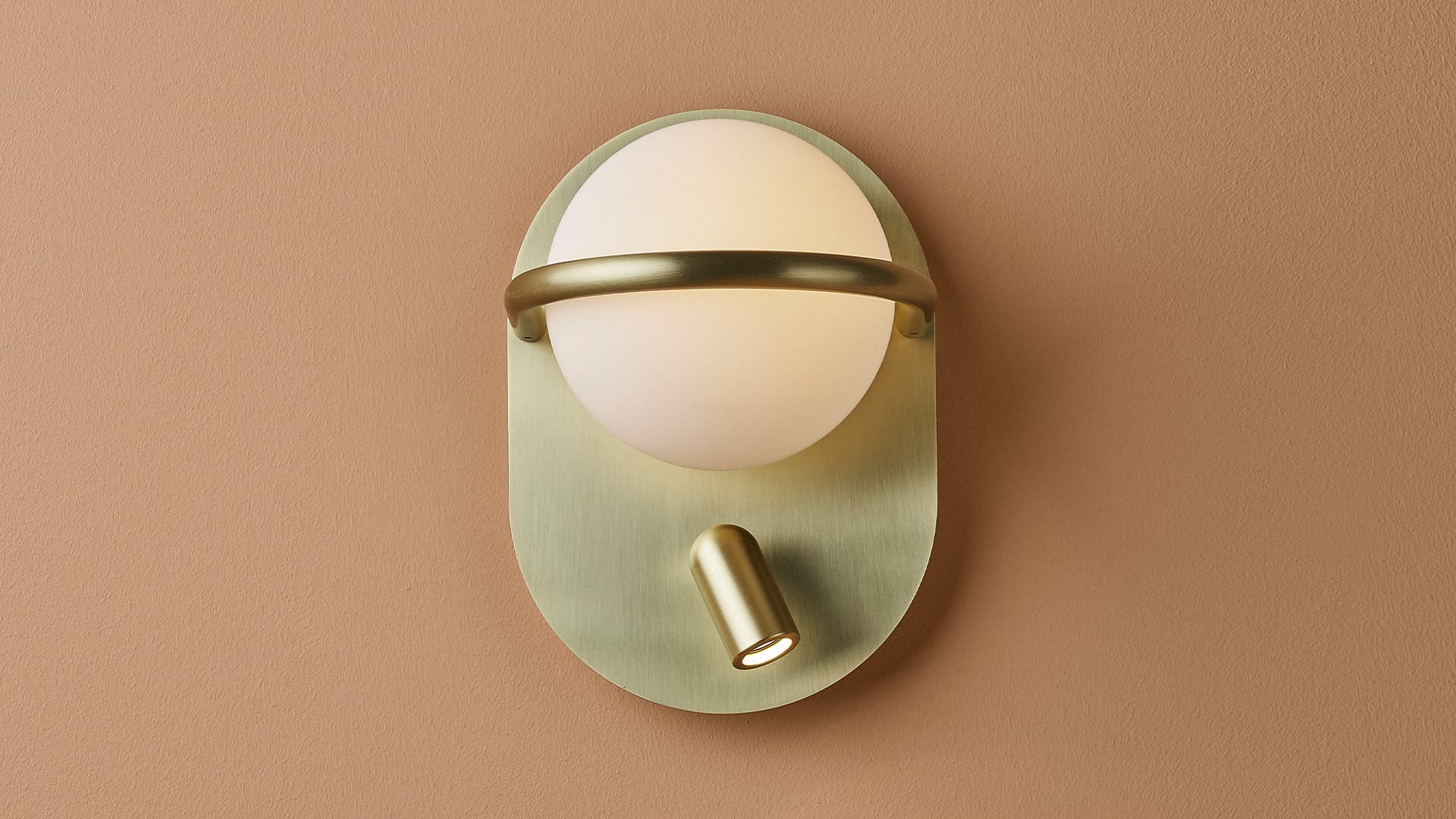 Decorative wall lamp consisting of an opal glass sphere and metal components finished in satin brass or matte black. Available in two versions: diffused light (1L), or diffused light and adjustable beam for reading (2L).