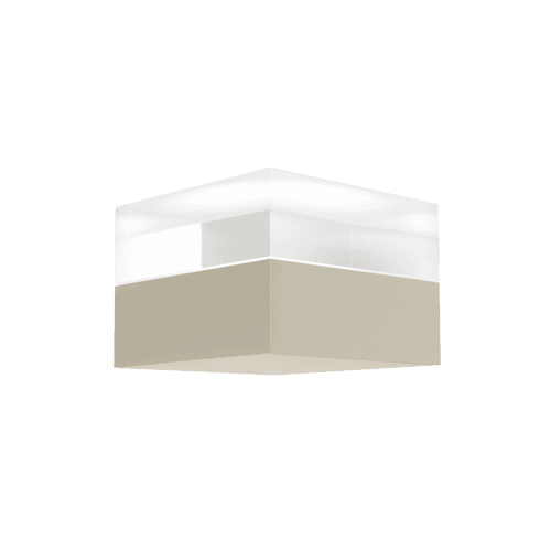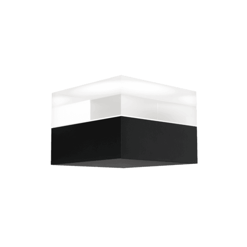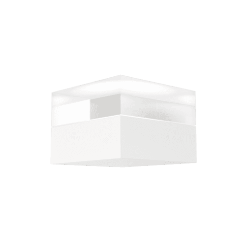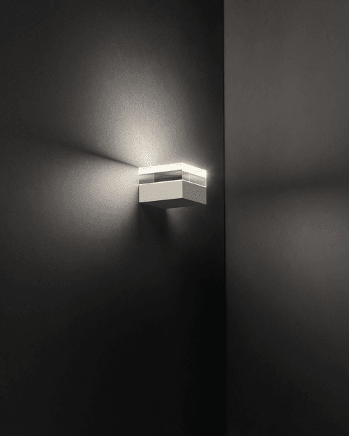 A very powerful, efficient indoor wall and ceiling lamp with dimmer, for indirect and diffused light, with an utterly uncluttered, ultra-compact design. A brick made of thick methacrylate is set above another with the same dimensions, made of matt lacquered steel. The first contains the light, the second diffuses it.