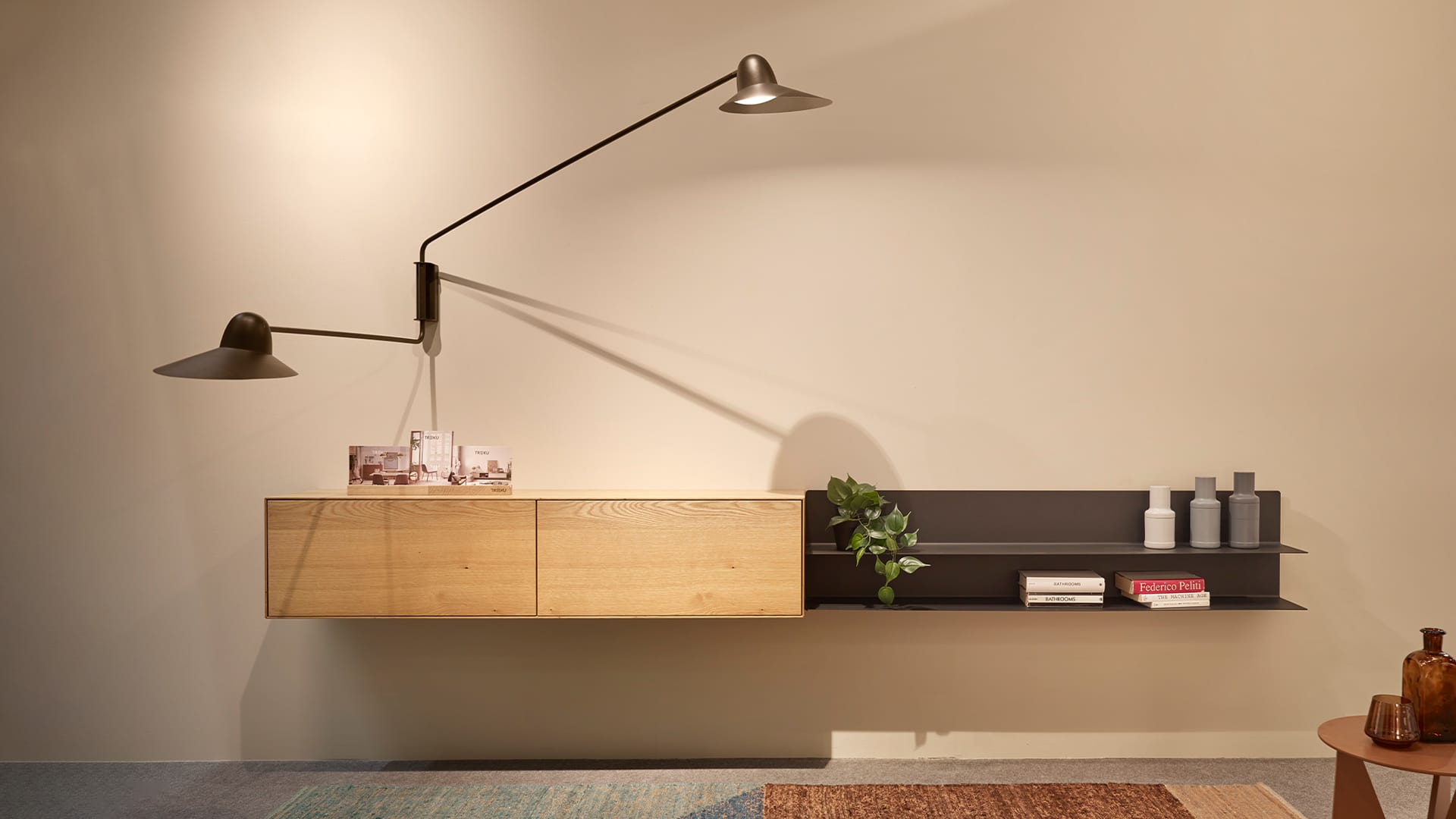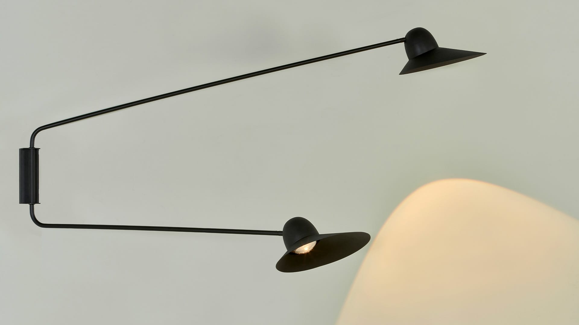 Wall lamp available in two models: the individual one has one arm (W1) and the double one has two arms (W2). The arms are made in metal and have a textured black or white finish. These arms are combined with two sizes of articulated shades: L and S. The L shade is made in aluminum and in solid textured matte black. The S shade is made in satin brass with a textured matte white finish on the outside, or in satin copper with a textured matte black finish on the outside. The Speers Arm W lamp is equipped with a high-luminance LED light source. It includes a glass lens that focuses the light and enhances its luminous efficiency. There is a plug-in accesory under request.