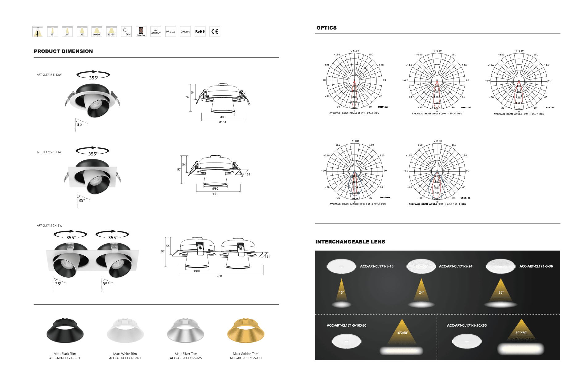 Šviesos kampas (°) | 15° / 24° / 36° / 10×60° / 30×60° |